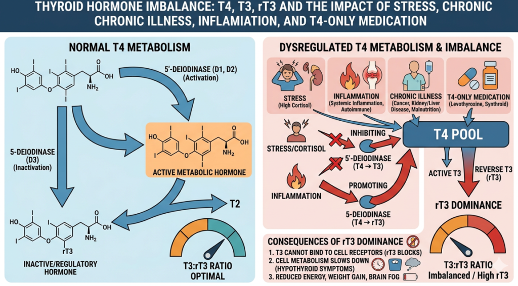 This means that even if your thyroid is producing enough T4 (which means your TSH levels and T4 levels on bloodwork will look normal), or if you are taking a T4 medication like Levothyroxine, your body may be redirecting that hormone into the "brake" pathway. You might find yourself in a frustrating loop where your lab tests look "perfect" to a standard doctor, yet you feel profoundly hypothyroid because your receptors are being blocked.